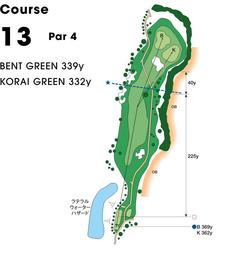 右側のネットを超えるとOB、210ヤード地点より右にドッグレックしている。